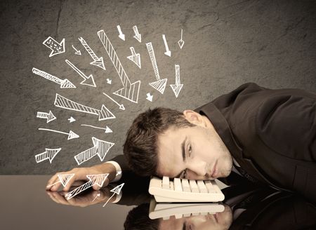 An exhausted business person resting his head on keyboard with pressure illustrated by arrows pointing at him concept