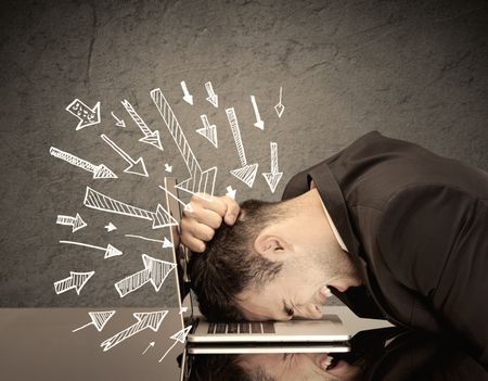 An exhausted business person resting his head on keyboard with pressure illustrated by arrows pointing at him concept