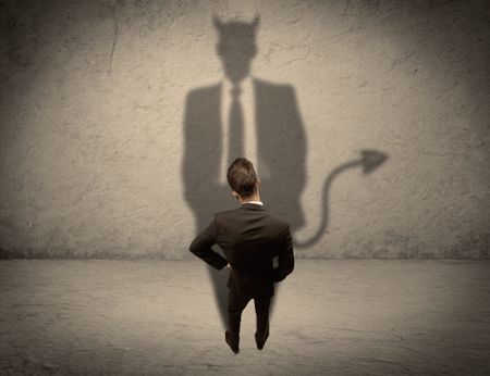 An experienced tricky businessman in suit looking at his devil desguise shadow reflected on the wall concept