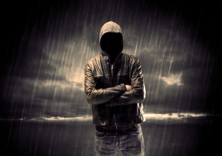A faceless thief in unrecognizable hoodie standing in the middle of the night in the rain in front of landscape concept