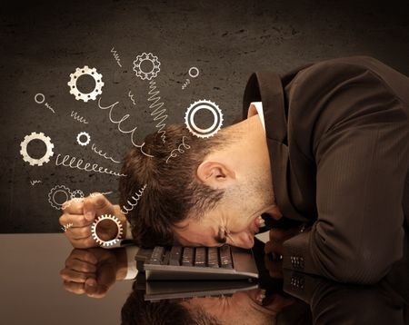 Falling apart illustration concept with cranks, cog wheels springing from a fed up and tired businessman's head resting on laptop keyboard