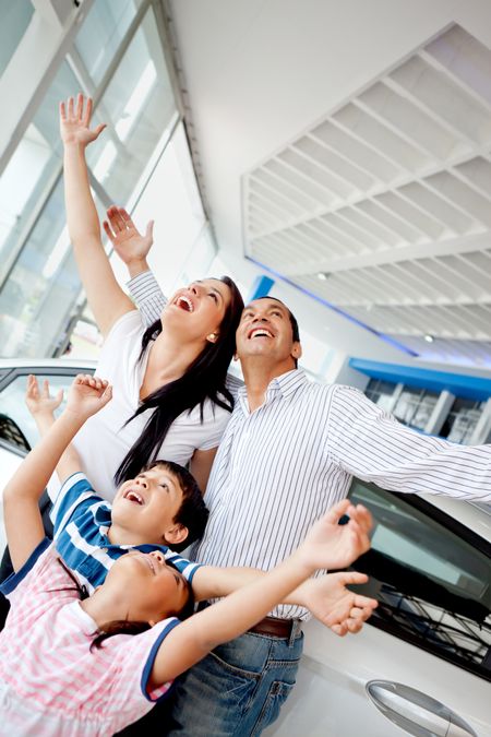 Family celebrating buying a new car with arms up