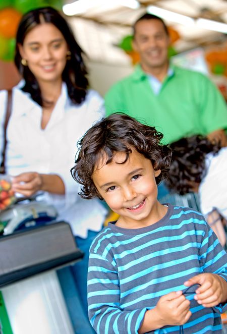 Family lifestyle portrait of a mum and dad with their two kids shopping in supermarket
