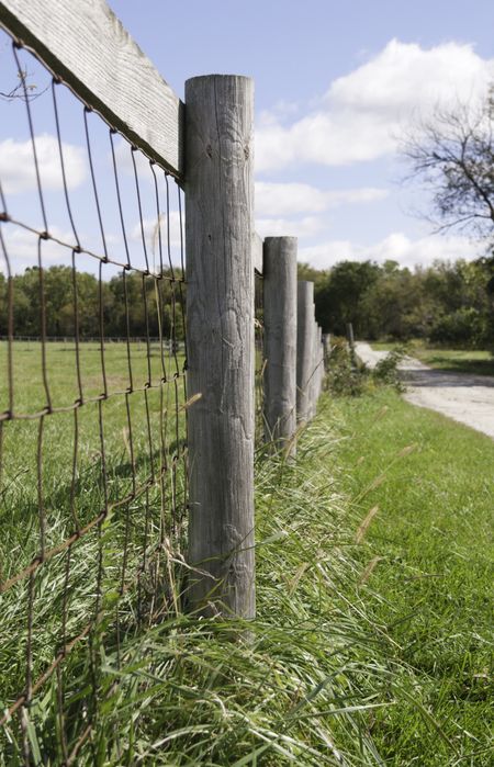Farm fence by dirt road in American Midwest (shallow depth of field; focus on post in foreground)