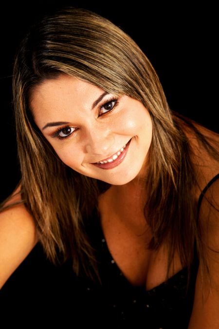 fashion or casual woman portrait giving a big smile - isolated over a black background
