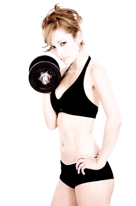 fashion girl in gym clothes lifting free weights isolated over a white background with a high key effect
