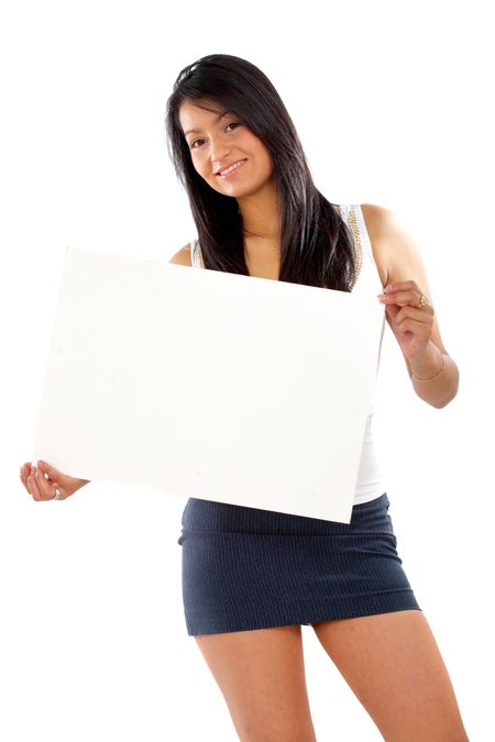 fashion woman holding a banner add or billboard isolated over a white background