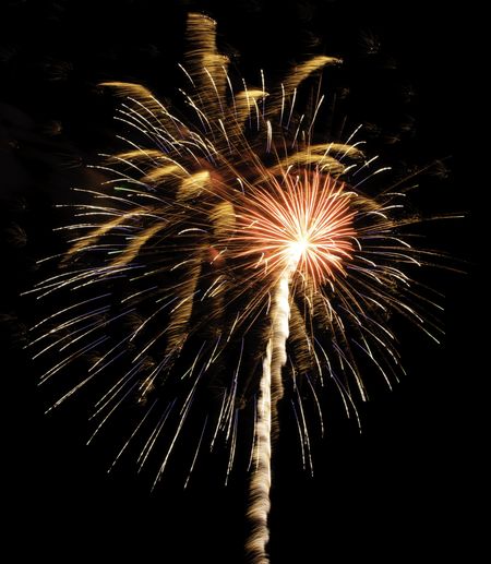 Feathery rocket trail to bright white burst of fireworks, with multicolored and motion-blurred bursts nearby