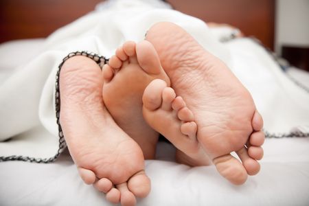 Feet of a couple lying in bed