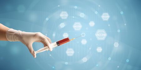 Female doctor hand holding syringe with blue background