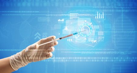 Female doctor hand holding syringe with blue background and charts