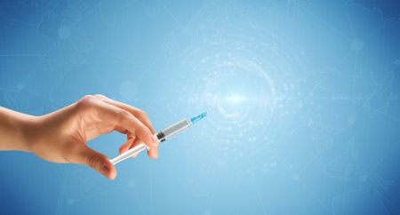 Female doctor hand holding syringe with blue background and shine