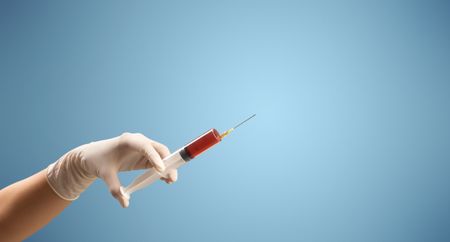 Female doctor hand holding syringe with blue background