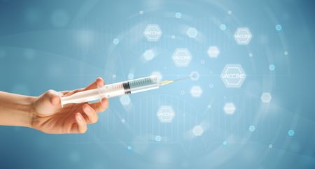 Female doctor hand holding syringe with blue background