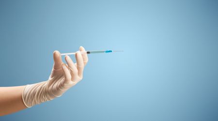 Female doctor hand holding syringe with blue background