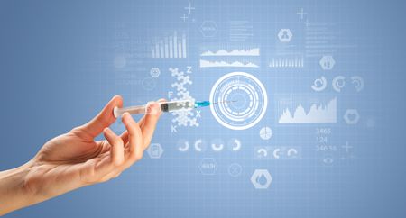 Female doctor hand holding syringe with research data graphic