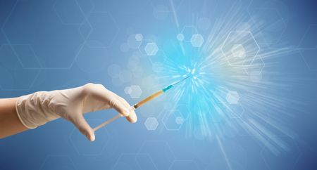 Female doctor hand holding syringe with shiny background