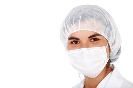 female doctor with a hat and a mouth cover isolated over a white background