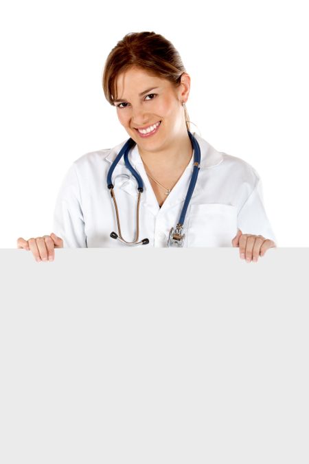 Female doctor holding a banner isolated over a white background