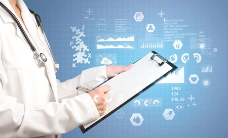 Female doctor holding notepad with blue background and data graphics