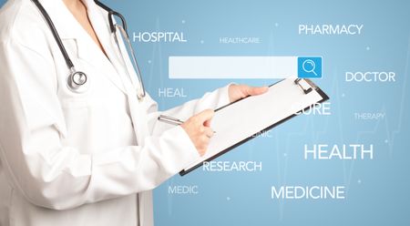 Female doctor holding notepad with blue background and search bar with hovering medical words