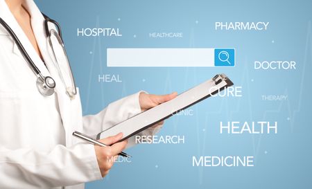 Female doctor holding notepad with blue background and search bar with hovering medical words