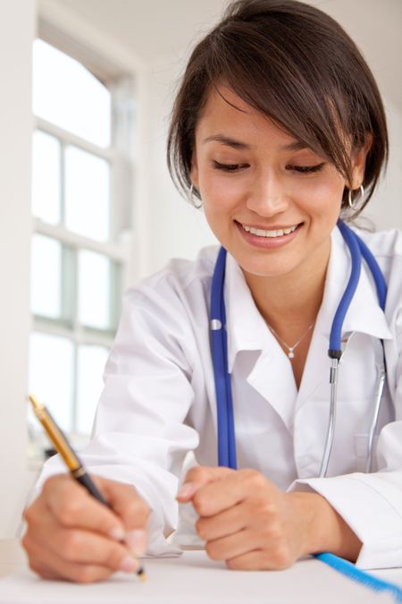 Female doctor at the hospital writing a medical history