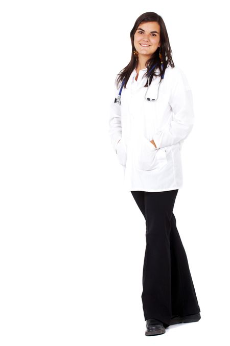 female doctor standing and smiling isolated over a white background
