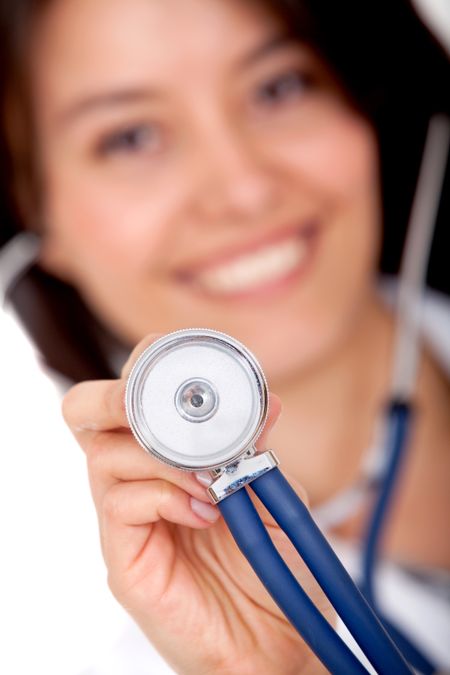 Female doctor with a sthetoscope isolated over a white background