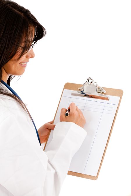 Female doctor writing on a clipboard - isolated over white
