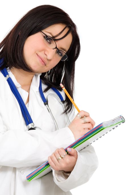 female doctor writing a prescription over a white background