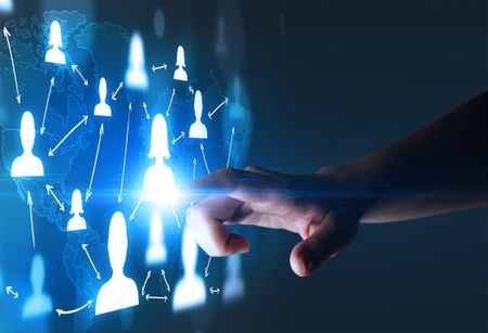 Female finger touching a beam of light surrounded by portraits and a world map behind it