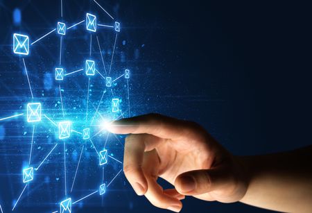 Female finger touching a beam of light surrounded by a blue graphic with envelopes