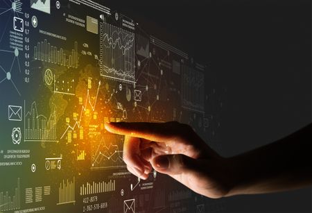 Female finger touching a beam of light surrounded by charts and graphs