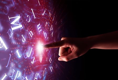 Female finger touching a beam of light surrounded by a pink background with alphabet letters