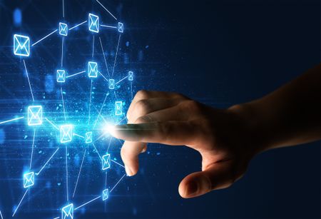 Female finger touching a beam of light surrounded by a blue graphic with envelopes