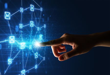 Female finger touching a beam of light surrounded by a blue graphic with envelopes