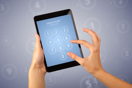 Female fingers touching tablet with locked device requiring passcode