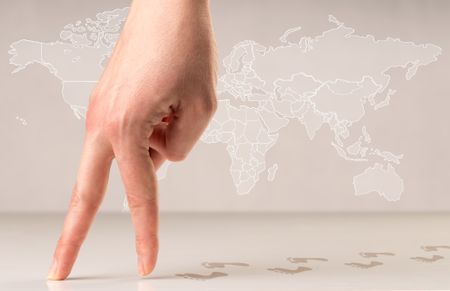 Female fingers walking with footsteps behind them and a world map in the background