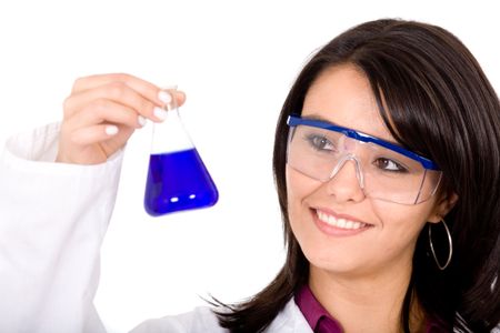 female girl in a laboratory holding a test tube isolated over a white background
