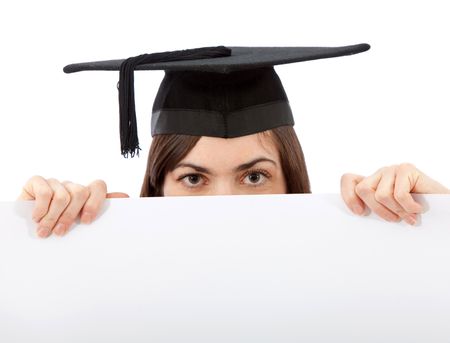 female graduate holding a banner ad isolated over a white background