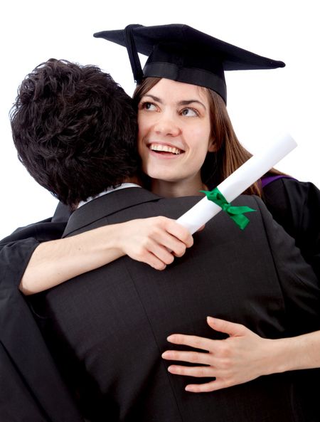 Female graduate hugging a man and celebrating - isolated