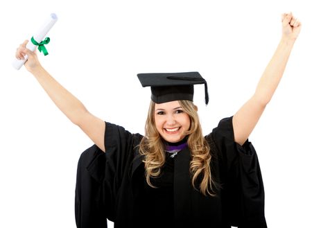 female graduation portrait smiling full of success with her arms up - isolated over white