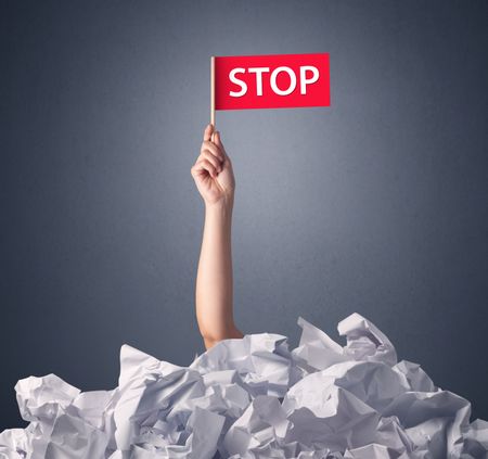 Female hand emerging from crumpled paper pile holding a red flag with stop written on it