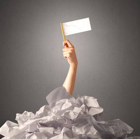Female hand emerging from crumpled paper pile holding a white blank flag