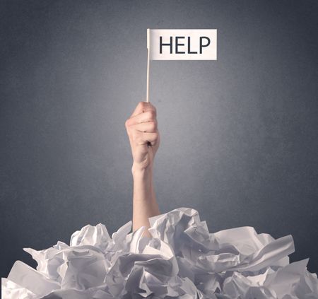 Female hand emerging from crumpled paper pile holding help sign