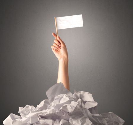 Female hand emerging from crumpled paper pile holding a white blank flag