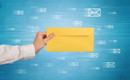 Female hand holding coloured and white envelope with blue background and message symbols around