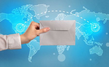 Female hand holding coloured and white envelope with blue map on the background