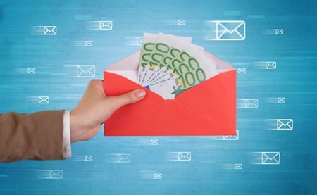 Female hand holding coloured and white envelope with blue background and message symbols around